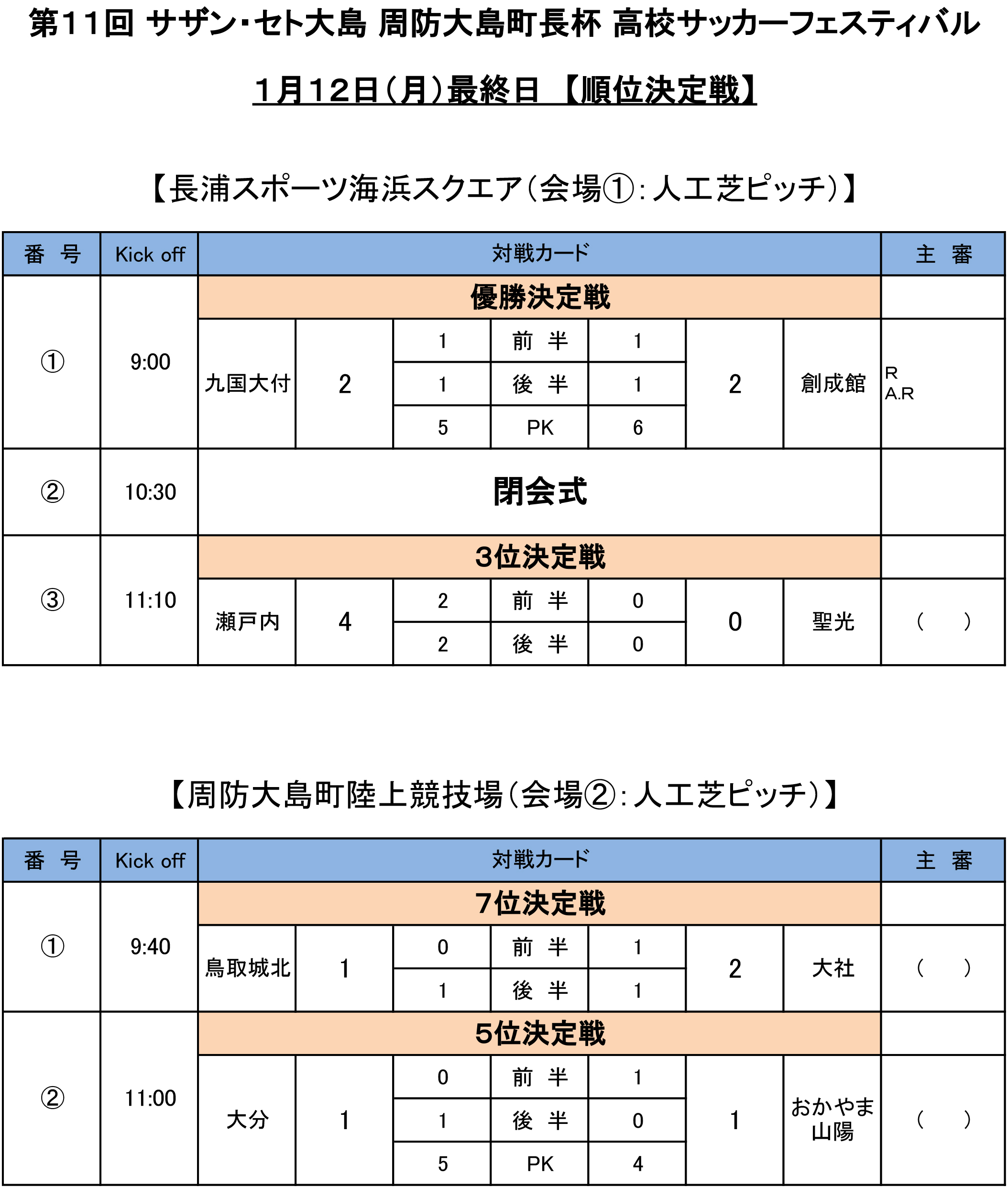 「第11回サザン・セト大島 周防大島町長杯 高校サッカーフェスティバル」順位決定いたしました。無事終了することができました。これも大会参加チームをはじめとする関係者の皆様のおかげです。ありがとうございました。